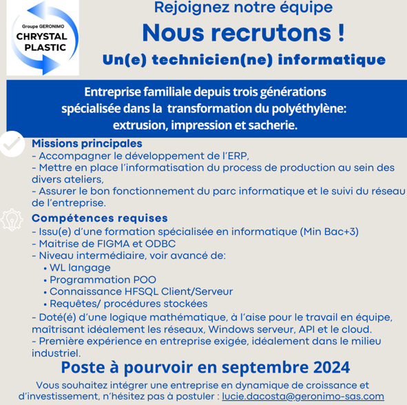 Envie de rejoindre une entreprise en pleine expansion, CHRYSTAL PLASTIC recrute !